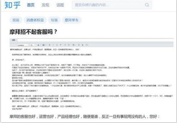 不仅仅如此,在知乎上一篇题为《摩拜招不起客服吗?》的文章更是将摩拜的“跪式客服“暴露无遗我从周三开始,起码打了有30遍你们的客服电话。一次也没有打通,每次都告诉我去APP上报问题,我第一天就提报了,提报以后都已经过了快5天了,什么反馈都没有,每次听连我都觉得羞,你们不觉得羞么?