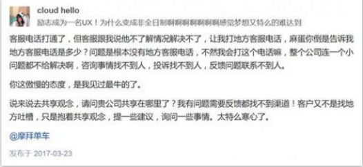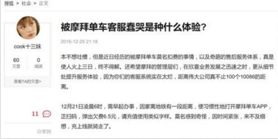 摩拜自称口碑第一 然终将敌不过拖后腿的高冷客服