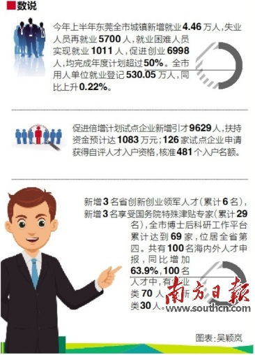 随着近年来产业转型升级的步伐加速,东莞的人才结构正在发生改变,高层次人才聚集呈加速之势。7月26日,东莞市人才培育扶持政策新闻发布会上,东莞市人力资源局通报了今年上半年重点工作情况和下半年计划,会上透露,今年东莞就业局势保持稳定,创新创业活力倍增,上半年城镇新增就业4.46万人。
