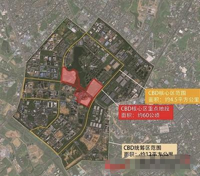 CBD统筹区约12平方公里,CBD核心区约4.5平方公里。其中,CBD核心区重点地段以CBD内松山湖大道两侧的未开发与可改造的32.46公顷用地为核心,向周边街区进行适当拓展,总用地面积约60公顷。