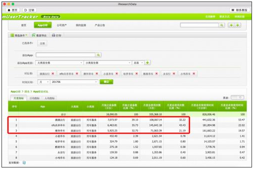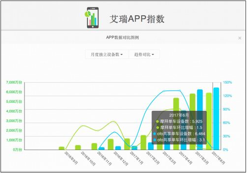 除了以上两个维度表现不佳,摩拜在体现用户粘性的多项数据中更是为负增长:在用户总使用次数上,摩拜为71063.39万次,与5月同期相比下跌超31%;在日均使用次数上,摩拜用户日均使用次数降至2368.78万次,同比下跌超27%;而在单个用户月度平均使用次数上,摩拜更是同比下跌33%。