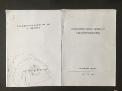 养殖户请上海海洋渔业监测站卫星测量鉴定,养殖损失面积为20000亩。事件发生后,我们近282户养殖户、4个养殖合作社多次打报告请求当地政府做出合理赔偿。龙港镇一名领导批示说,所有养殖物系非法养殖,一律不赔偿……