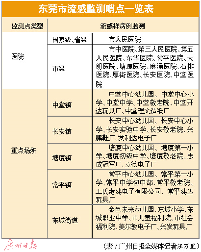 其中,对流感样病例的监测又分医院监测哨点和重点场所监测哨点。东莞市人民医院是国家级和省级监测哨点,市中医院、第三人民医院、第五人民医院等是市级监测哨点。(详见列表)