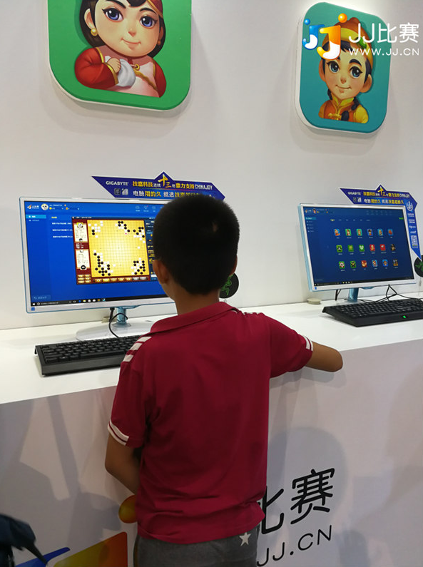 JJ比赛首创的竞技棋牌受到了全年龄段玩家的喜爱,游戏体验区被玩家围得水泄不通,争先试玩斗地主、麻将、捕鱼等精品游戏。小编的镜头就捕捉到了一只“零零后”安静地玩围棋的画面,小小年纪技术了得!