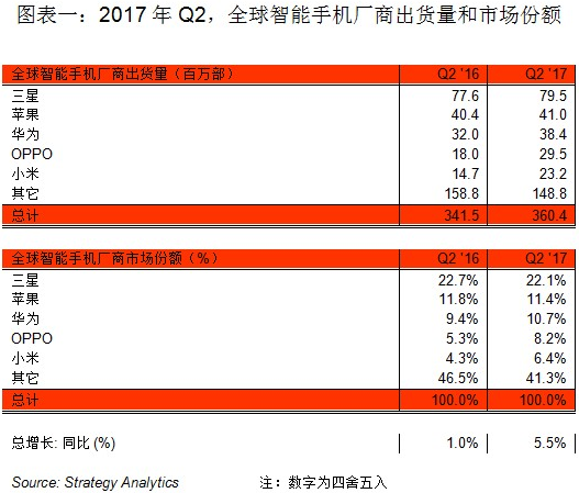 日前,知名市场调研机构Strategy Analytics发布了2017年第二季度全球智能手机厂商出货量及市场份额报告。报告指出,2017年第二季度全球智能手机的出货量达到3.6亿部,其中OPPO出货量达到2950万台,成为增长速度最快的手机厂商。