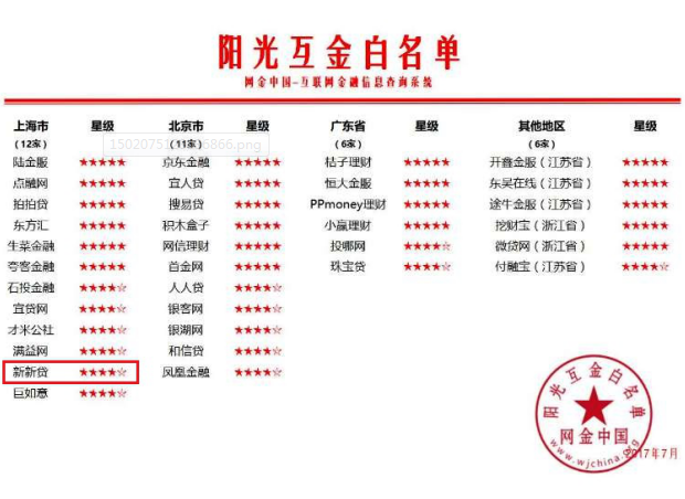 7月份阳光互金白名单已正式公布,新新贷榜上有名,这是新新贷连续三个月入选阳光互金白名单!