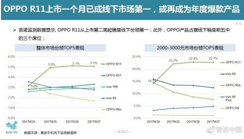 近几年,OPPO呈现爆发式增长,推出的每一部手机都成为了爆款。市场调研机构CounterPoint 的数据显示, OPPO R9成为 2016年中国最畅销的手机单品;SA的数据则显示,R9s成为了Q1全球最为畅销的安卓手机;而6月份上市的R11也表现出了超强的市场号召力,上市一个月的销量已经达到R9同时间段的1.5倍。在赛诺7月份发布的数据显示中,上市不到两周时间,OPPO R11销量已突破百万,稳居线下市场份额第一。