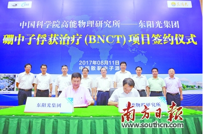 8月11日上午,中国科学院高能物理研究所与东阳光集团在东莞市中国散裂中子源园区内,举行了硼中子俘获治疗(简称BNCT)项目合作签约协议。该项目有望在未来5年内开启全国治疗肿瘤疾病的新时代,这也标志着散裂中子源在莞产业转化迈出第一步。中国科学院院士、高能物理研究所所长王贻芳表示,未来高能所将在产业化应用方面进行更多探索,继续助力广东省和东莞市实现创新驱动发展。