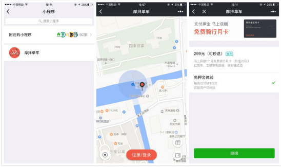 参加活动的方式十分简单,通过微信小程序注册摩拜单车账户,就可以参加“免押金试骑”,通过摩拜单车App或通过微信“扫一扫”骑行都可以。每周享受5次免押金骑行;缴纳押金后,还能领取免费骑行30天的月卡。