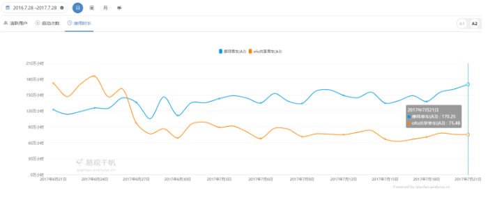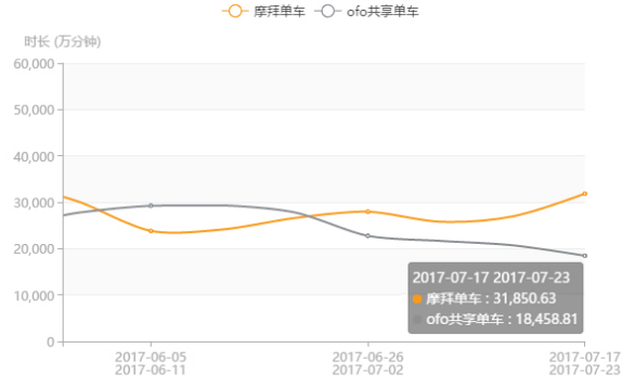 易观数据显示,6月21日~7月21日,摩拜单车日活跃用户量从653万增长至855万,增幅为31%,ofo小黄车从1031万下滑至513万,降幅为50%;同一时间,摩拜单车APP日启动次数从1863万增长至2411万,增幅为29%,ofo小黄车从2666万下滑至1281万,降幅为52%;摩拜单车APP日使用时长从123万小时增长至170万小时,增幅为38%,ofo小黄车从172万小时下滑至75万小时,降幅为56%。