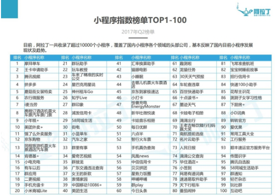 近日,国内权威微信小程序统计平台阿拉丁发布了《2017年Q2小程序指数榜单》,摩拜单车高居榜首,成为第二季度最热门微信小程序。从三家数据机构的数据报告来看,摩拜单车在第二季度表现优异,尤其在刚刚过去的7月份更是领先ofo小黄车,并保持稳步增长的趋势。