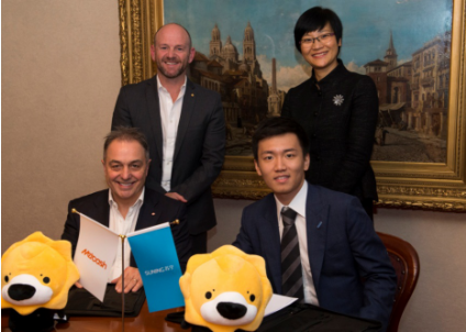 (图:苏宁国际副总裁张康阳与Metcash集团CEO Ian Morrice在新南威尔士州商务部长Niall Blair(后排左)及澳大利亚贸促会官员刘冰(后排右)见证下签订战略合作协议)