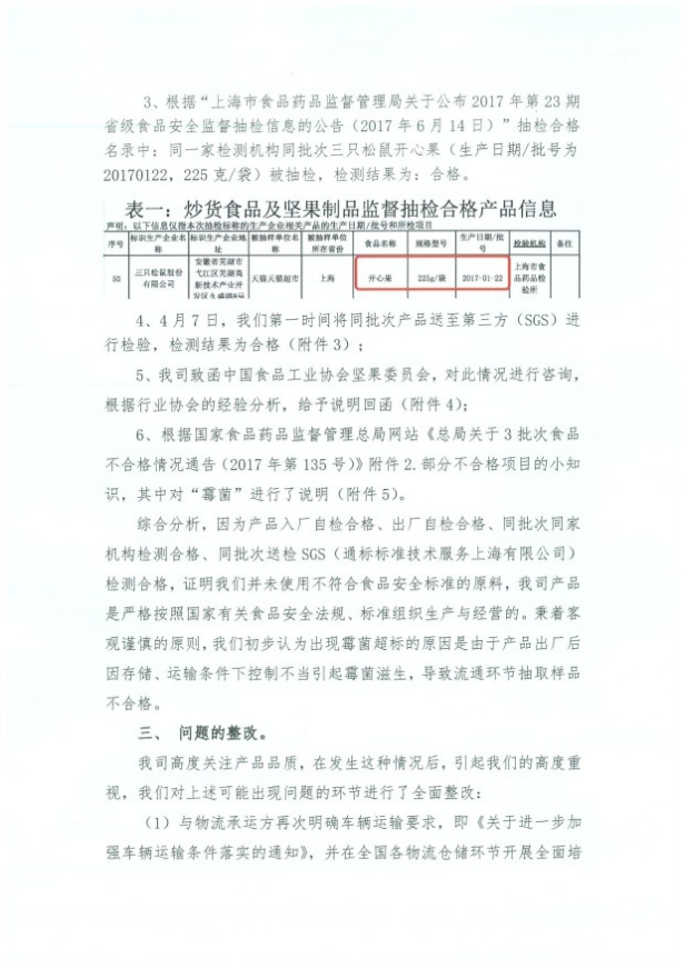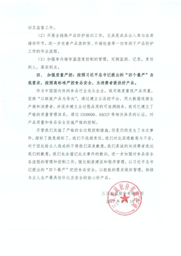 继昨日爆出三只松鼠开心果问题产品事件后,三只松鼠今日再次真诚致歉回应消费者:据悉,该事件反馈发生于2017年4月,截至6月,三只松鼠在当地食药监局的指导、调研下完成整个事件的彻查处理。三只松鼠针对“该批次产品”的自检、送检皆显示合格,同时在收到监管部门反馈的上海市食品药品检验针对“该批次产品”抽检结果的异常报告后,也迅速申请复检,最终显示合格。