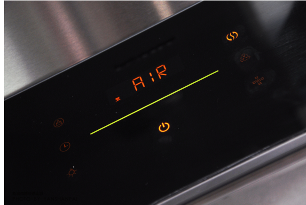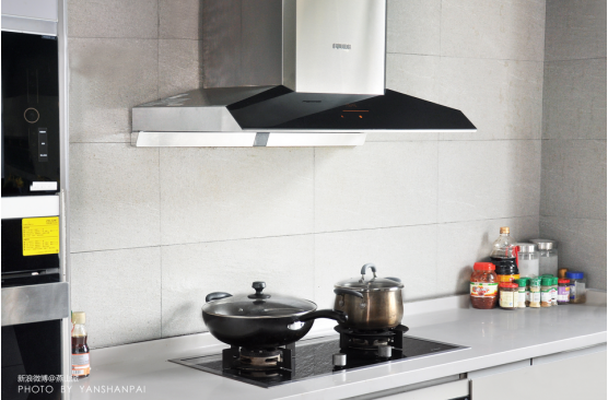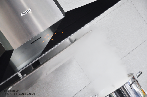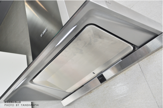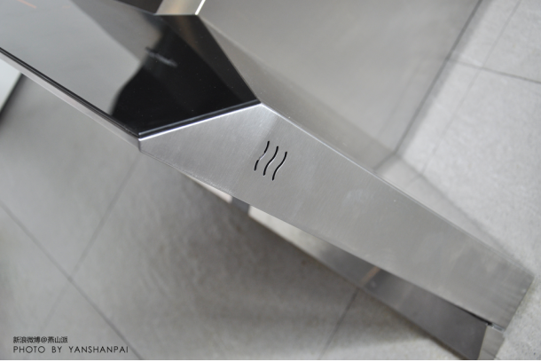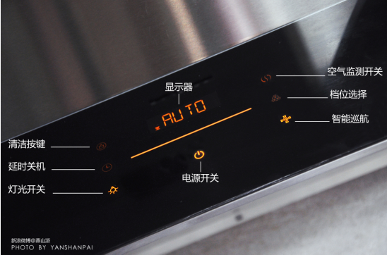 “天际线”十分醒目,显示器、电源按键、清洁按键、延时关机键、灯光开关、空气监测键、档位切换键、智能巡航键,合理地分布在天际线周围,让用户可以对按键进行定位、操作,美观的同时提升了操作的便捷性。而且天际线还是一个指示灯,在开启厨房空气管家状态下可以通过不同的色彩让我们第一时间了解厨房空气的优良状况,后面的功能体验部分燕山派会详细介绍,这里不做过多阐述。