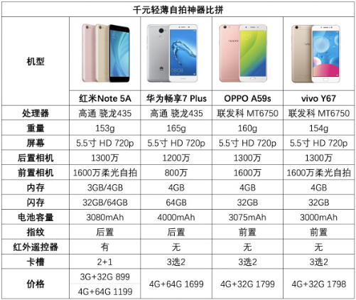 这里有一张一目了然的表格,大家可以看一下,图中红米Note 5A为带1600万像素柔光自拍的高配版: