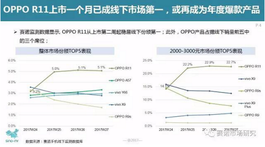 凭借在手机外观和拍照功能上一贯的坚持和不懈努力,以及对用户真正需求的重视,OPPO手机几乎每年都会打造一款爆款。2016年OPPO R9s接棒R9成为线下市场最畅销手机产品,更创下连续三个月销量第一的成绩。2017年新推出的OPPO R11上市一个月就已成为线下市场第一,再度成为年度爆款。
