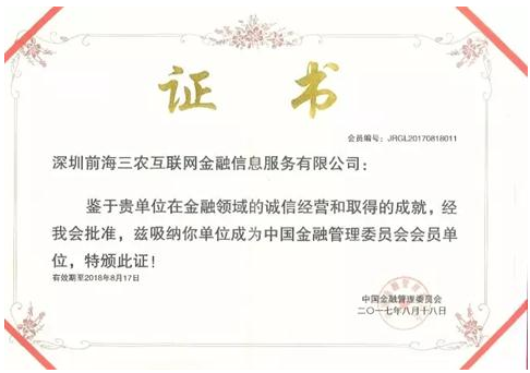 据了解,三农金服发展到现在,一直以农户为服务核心,致力于打通农村金融最后一公里。在发展过程中,展现出了优秀金融企业的自信与担当,着眼未来,以高瞻远瞩的战略发展眼光,抢抓绿色金融发展机遇,积极发展农村金融,专注农村消费金融。为农户农企提供信用贷款、消费分期、产业供应链等金融体系服务,以B2P及O2O结合的模式积极推进惠农支农举措。2017年8月18日,成为中国金融管理委员会会员单位!