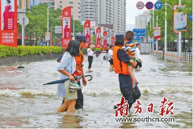 记者看到,虎门消防大队的官兵、虎门边防检查站官兵和虎门公安分局的民警治安队员,在虎门镇委书记叶孔新、镇长邓卫洪的指挥下,分组行动,他们拿着救生圈、救生绳,在长堤路水流深而急的路段,拉起一根根“生命通道”,将被困的群众从被水围困的房屋中救出来。