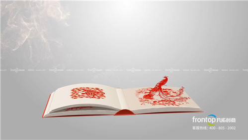 凡拓以亳州传统文化特色“剪纸”为开篇:一本记录着剪纸工艺的书缓缓打开,书上静态的剪纸“凤凰”展翅飞出,穿过祥云,飞过盛开的芍药花阵。
