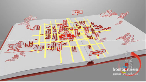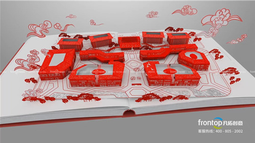 承接开篇剪纸创意,在书上呈现项目区位的三维动画“剪纸地图”,通过剪纸建筑、剪纸装饰(祥云、树木等)营造具备历史文化气息的空间感,并以牌匾形式标注区位信息。