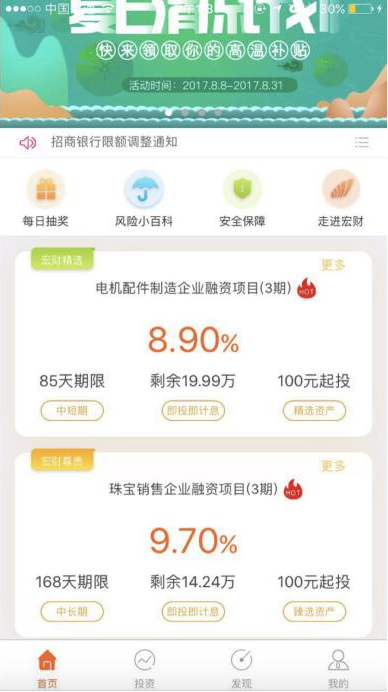 2017年8月8日宏财网新版app正式上线,经过产品部与技术部近一个地设计、编程、测试,新版app从ui到项目展示再到个人中心均有不同程度上到调整,给用户以耳目一新到感觉和更顺畅到使用体验。