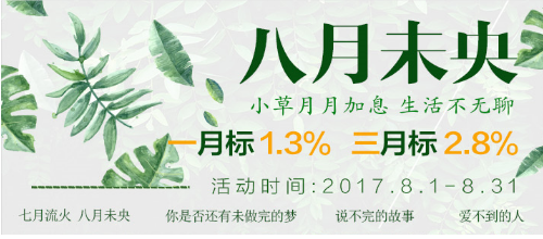 此次,为了回馈新老客户,小草金融在8月伊始就推出了全面的加息活动,一月标加息1.3%,三月标加息2.8%,同时,从8月18日开始,小草金融APP还隆重推出了幸运大转盘活动,不仅中奖机会高达百分百,更有加息券、现金红包等大放送,惊喜不断,幸运不停,让你在整个八月,整个七夕都能约“惠”理财,坐享财富升值。