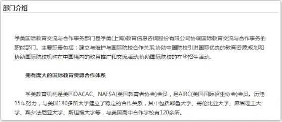 但是与此同时,学美教育在其官方网站所列示的服务内容,却比单纯的留学咨询丰富许多,甚至该公司还设立有“合作事务部”,部门职能中就包括“建立与维护与国际院校合作关系”,也即学美教育与部分国际院校之间是存在合作关系。很显然,这已经属于留学中介公司所能提供的服务内容了。