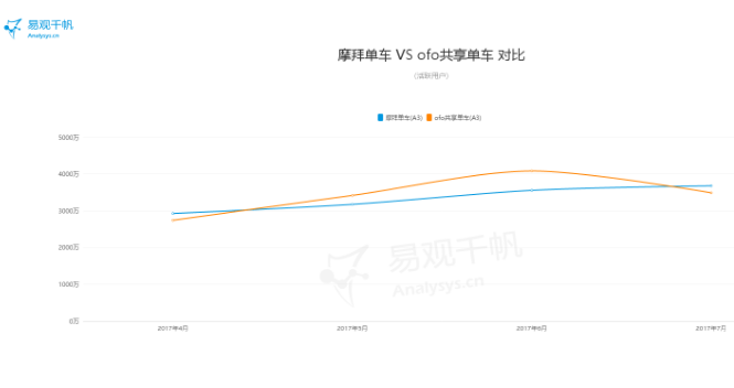 根据报告显示,摩拜月活跃用户量为3673万,环比增长3%;ofo数据为3482万,环比下滑15%,下滑趋势明显。从日均活跃用户量来看,摩拜单车达738万,环比增长13%,;ofo则今年6月的最高点下滑至554万,环比降幅35%,出现“断崖式下跌”。摩拜单车的领先幅度达33%。