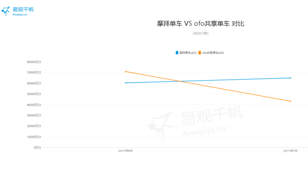 另外,从APP启动次数方面来看,今年7月摩拜单车APP启动次数达6.48亿次,环比增长8%;ofo启动次数为4.32亿次,环比下滑39%;摩拜单车的领先幅度约50%。在APP日均启动次数方面,摩拜最新数据为2091万次,环比增长4%;ofo为1395万次,环比下滑41%,摩拜依旧领先50%。
