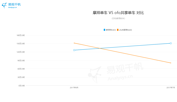 不仅如此,在APP使用时长重要测量指标中,摩拜单车表现更是凸显,其中APP使用时长达4680万小时,环比增长23%;ofo则为2513万小时,环比下滑45%。摩拜单车的领先幅度约为86%。在日均APP使用时长指标中,摩拜为151万小时,环比增长19%;ofo为81万小时,环比下滑47%。