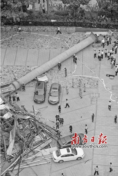 事发突然,在现场,来自公安、消防和东城街道办事处的主要负责人已经到场指挥救援。由于广告牌非常重,摔破的钢片、铁片到处可见,现场处理难度不小,需要使用重型机械方可。