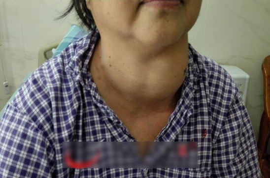 女子脖子长出两个拳头大甲状腺肿物