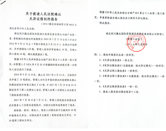 8月14日,本报以《湖北利川:3.8亿政府招商引资项目为何被破产》为题,报道了利川市腾龙国际度假酒店旅游发展有限公司(以下简称腾龙公司)破产重整中发生的一系列问题。文章刊发后被人民网、中国网等新闻网站转发,引起强烈反响。其间,本报记者再次赶赴湖北对该事件进行了后续采访。8月18日上午,利川市人民法院审判委员会专职委员、腾龙公司破产案件审判长谭华容接受记者采访时表示,《湖北利川:3.8亿政府招商引资项目为何被破产》一文刊发后,利川市委、市政府等相关部门领导高度重视,指示法院将报道中涉及的问题作出舆情分析,如果是真实的,要进行整改,如果不是真实的,要以书面形式作出说明。同日下午,利川市委常委、市委政法委书记郑至吾接受记者采访时表示,市委、市政府下文要求,不得干预法院办案,如果法院办案有违规,或者违反了程序,当事人可以给法院提出申请,让法院自己纠正,也可以向法院的上级部门反映,让上级部门纠正。