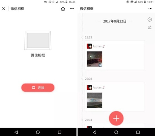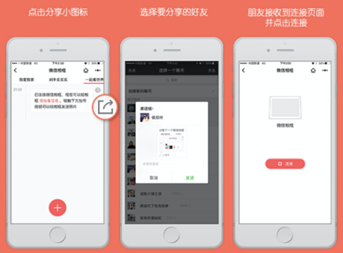 小程序的应用改变了这种连接方式,你可以选择分享自己的「微信相框M」,给微信好友或者微信群,他们只要点击一键「连接」即可。这样的连接方式,使亲朋好友不受空间限制,不需经历繁琐的步骤,便能实现大家一起分享、沟通。