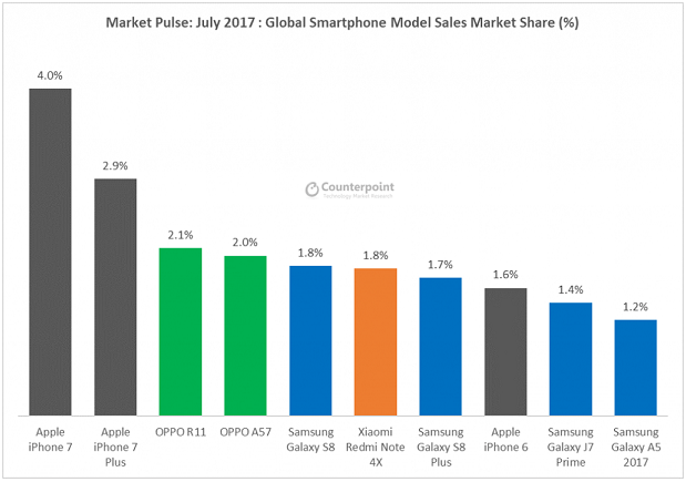 Counterpoint:OPPO R11为7月全球市场销量最高的安卓手机