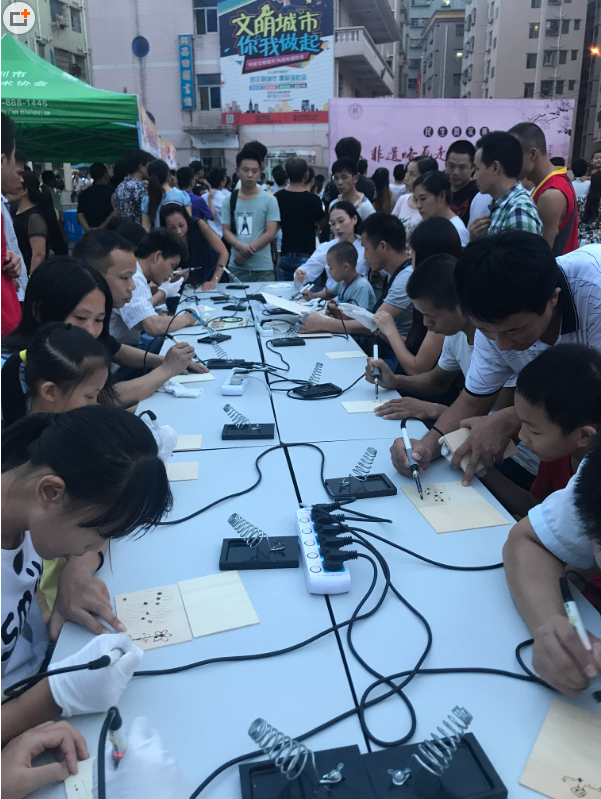 为了丰富光明新区市民的业余文化生活,进一步推动光明新区民生微实事项目做好做实,以共创和谐社区为主,充分展示非遗烙画独特魅力,增加新区市民幸福指数。9月10日下午,2017年“民生微实事•非遗烙画走进幸福西田”活动在西田社区文化广场拉开了帷幕。此次活动由光明新区公明办事处西田社区工作站主办,光明烙画基地、深圳市烙画艺术协会联合协办。来自烙画基地的烙画艺术家曲柏思、黄五生、冯 军及现场市民等200余人参加了此次活动。