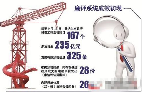 依靠“制度+科技”,为监督执纪插上科技的翅膀,由市纪委牵头建设的市政府投资工程廉情预警评估系统(以下简称“廉评系统”)成效初现。截至9月16日,廉评系统共纳入市政府投资工程监管项目167个,涉及资金235亿多元,系统预警分布合理,已发出325条有效预警信息,对政府投资工程的各个环节都做到监督预警。