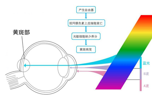 蓝光大量存在于电脑显示器、荧光灯、手机、数码产品、显示屏、LED等光线中。短波蓝光是波长处于400nm-480nm之间具有相对较高能量的光线,该波长内的蓝光会使眼睛内的黄斑区毒素量增高,严重威胁我们的眼底健康。