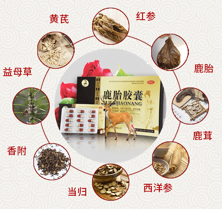 鹿胎胶囊,经OTC国药认证,千年验方,主要成分为鹿胎,它可以疏通淤堵、调经养巢,同时复配鹿茸、阿胶、红参等二十四味名贵药材,通淤散寒,补气养血,调经养颜。