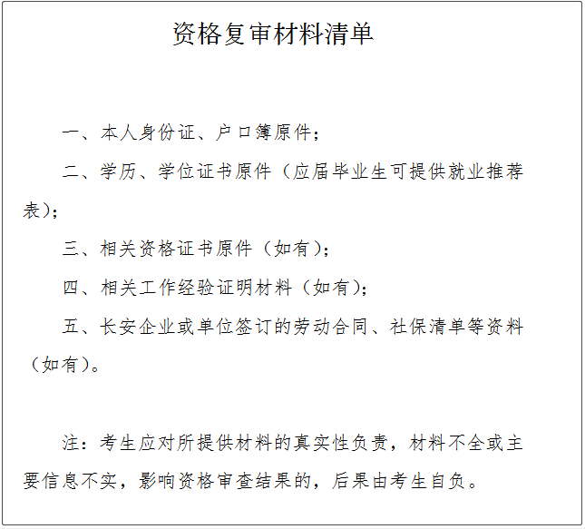 考生本人于指定时间段内携带资格复审材料(详见下图)原件及复印件到长安镇长青南路1号万科写字楼5103室进行审核。未按规定进行资格复审的或资格复审不通过的取消考试资格。