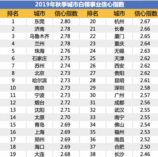 从地域上来看,在被调研38个城市的事业信心指数中,位列前五的城市为东莞、济南、乌鲁木齐、兰州、珠海,指数分别为2.80、2.78、2.78、2.78、2.76。一线城市中排名最好的是北京,位列第8,其次为位列第16的上海,深圳与广州分别排名第29与第30。当然,这也与各城市等级的就业景气度密切相关。