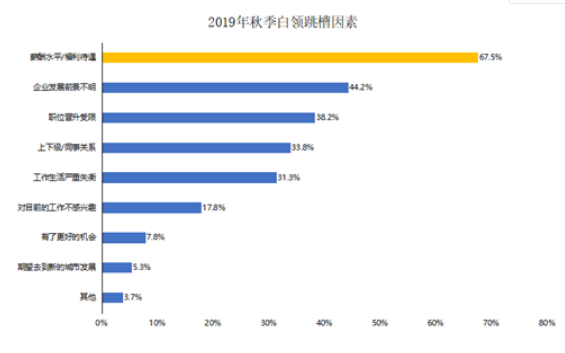 白领们总说,“今年是我找工作最难的一年”,那么今年到底难不难? 2019年秋季跳槽意愿调研显示,52.7%的白领认为今年跳槽难度高于往年,57.3%白领有实际跳槽行动,较去年同期的52%有所提升。而薪酬水平、福利待遇成为大多数白领跳槽的动力。