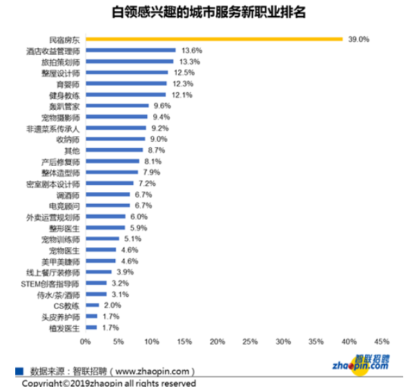 调研显示,56.2%白领表示随着城市服务行业蓬勃发展,将考虑加入其中。白领最感兴趣的三个城市服务新职位分别为民宿房东、酒店收益管理师与旅拍策划师,均为旅行相关职位,在白领心中,诗和远方总是抹不去的印记,符合当下白领追求自我、体验生活的内心期望。