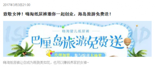 据了解,这次“女神节招募合伙人“活动将会持续一个月,直到4月5日才结束,奖励也是非常丰厚,一等奖有巴厘岛双人旅游,二等奖有24k金钥匙,三等奖有嗨淘纸尿裤一包,有意向发展副业的女性朋友们可以考虑一下。