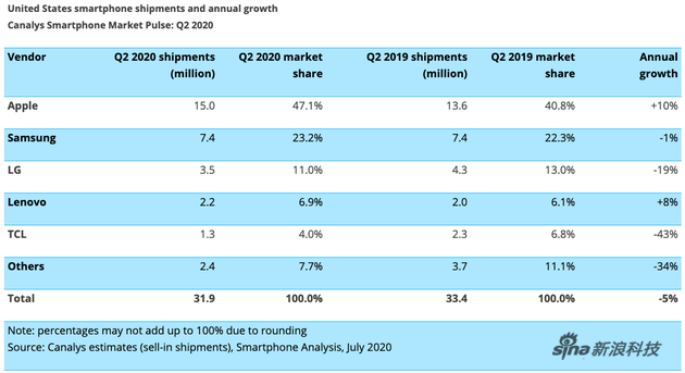 2020年第二季度,美国国内销售了3190万部智能手机,同比下降5%,但环比增长11%。 3月底中国的疫情得到控制,手机制造工厂恢复运营,5月和6月重新开始,这是市场连续增长的关键因素。