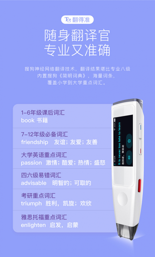哪个品牌的词典笔比较好之查词速度与准确率的对比:以前查词以纸质词典查词为主,既费时又耗力,而现在电子词典查词直接秒杀传统词典,既快速又方便。有道词典笔和搜狗出品的糖猫词典笔,这俩款都是OCR文字识别技术,可以通过扫描就可以自动识别查词,不管杂志,书籍都可以扫描识别。而搜狗出品的糖猫词典笔在查词上,官方提供的查词准确率为98%,但是经过多次测试过程中,糖猫词典笔准确率为99.8%,有道词典笔准确率为98.7%。总之词典笔查词又快又准确,提高了学生学习效率。