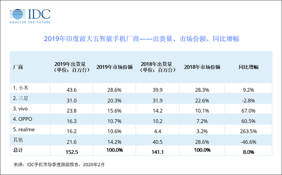 但中国手机品牌占据印度手机市场份额近80%。根据研究机构IDC数据,2019年,小米在印度出货量为4360万部,市场份额第一,占据28.6%。vivo出货量为2380万部,市场份额第三位15.6%。OPPO和Realme各出货1630万和1620万部,排名第四和第五,市场份额为10.7%和10.6%。